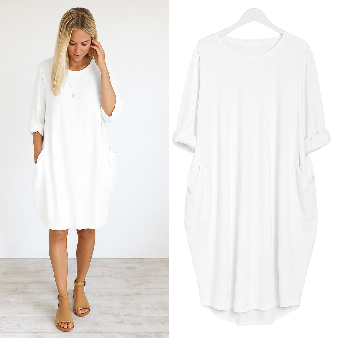 De verfijnde Ellen™ jurk brengt tijdloze elegantie samen met ultiem draagcomfort. Dankzij de losvallende pasvorm en luchtige stof creëert deze jurk een prachtig silhouet dat flatterend is voor elk figuur. Met haar lange mouwen en diepe, praktische zakken is Luna™ perfect voor vrouwen die stijl, comfort en functionaliteit willen combineren.